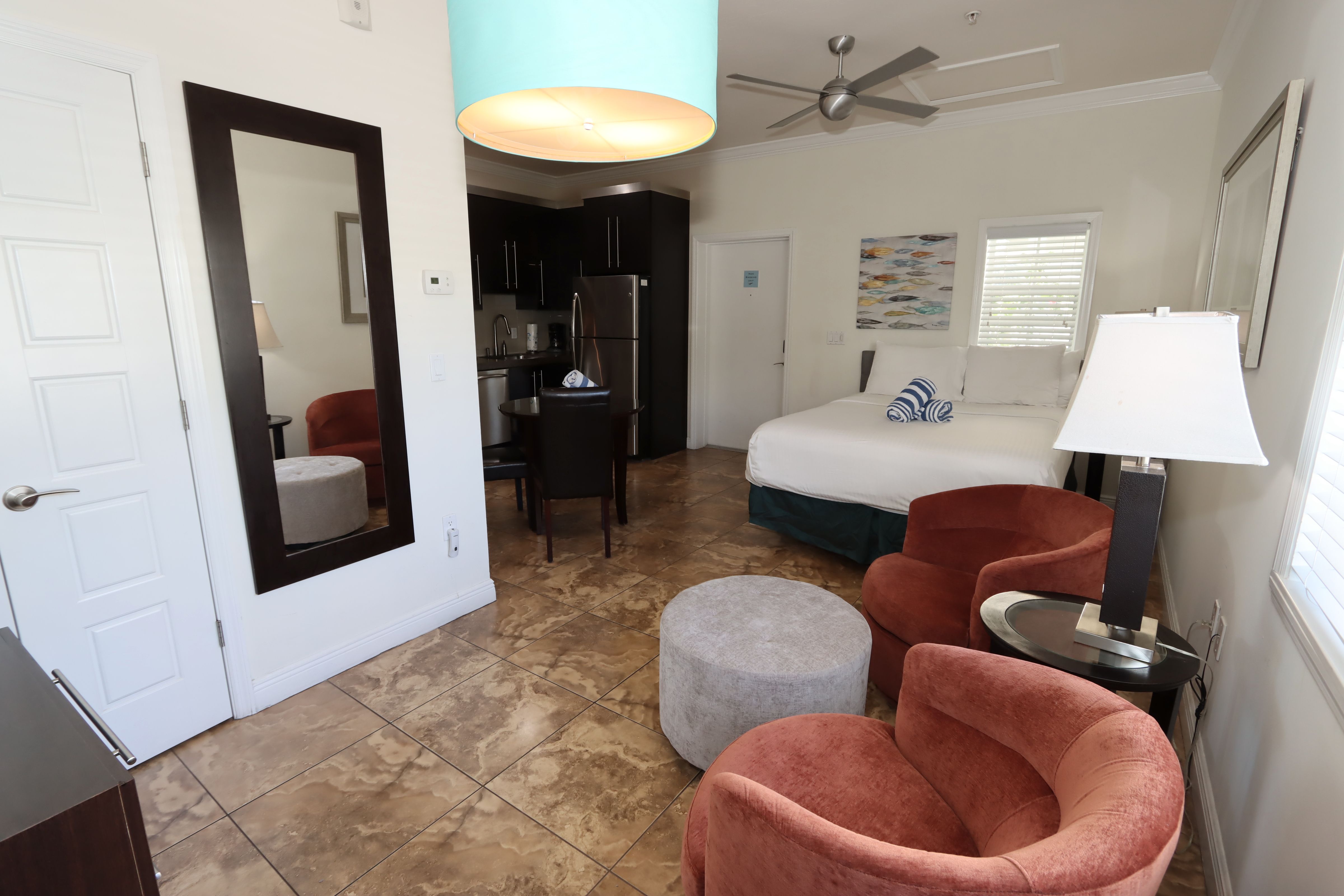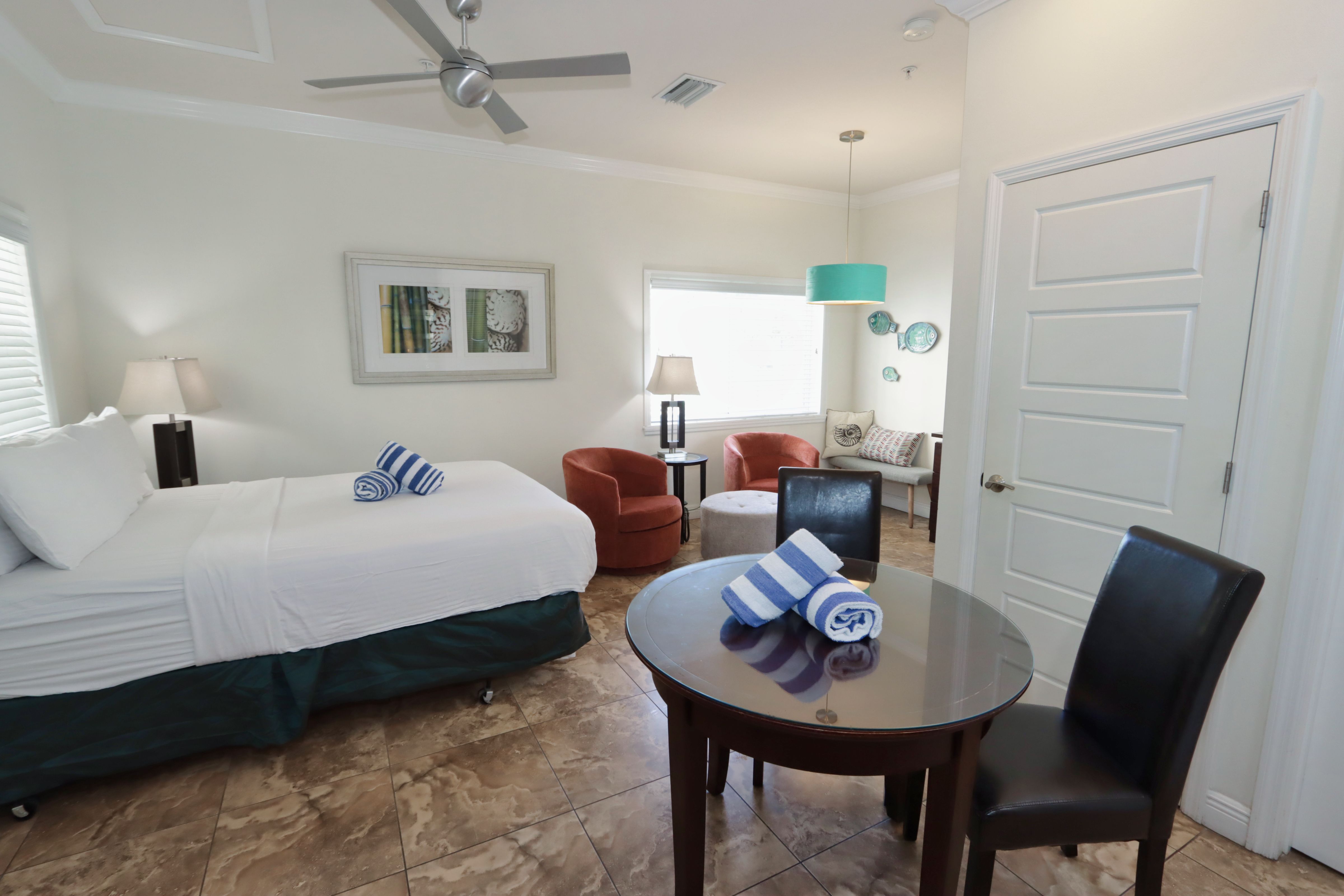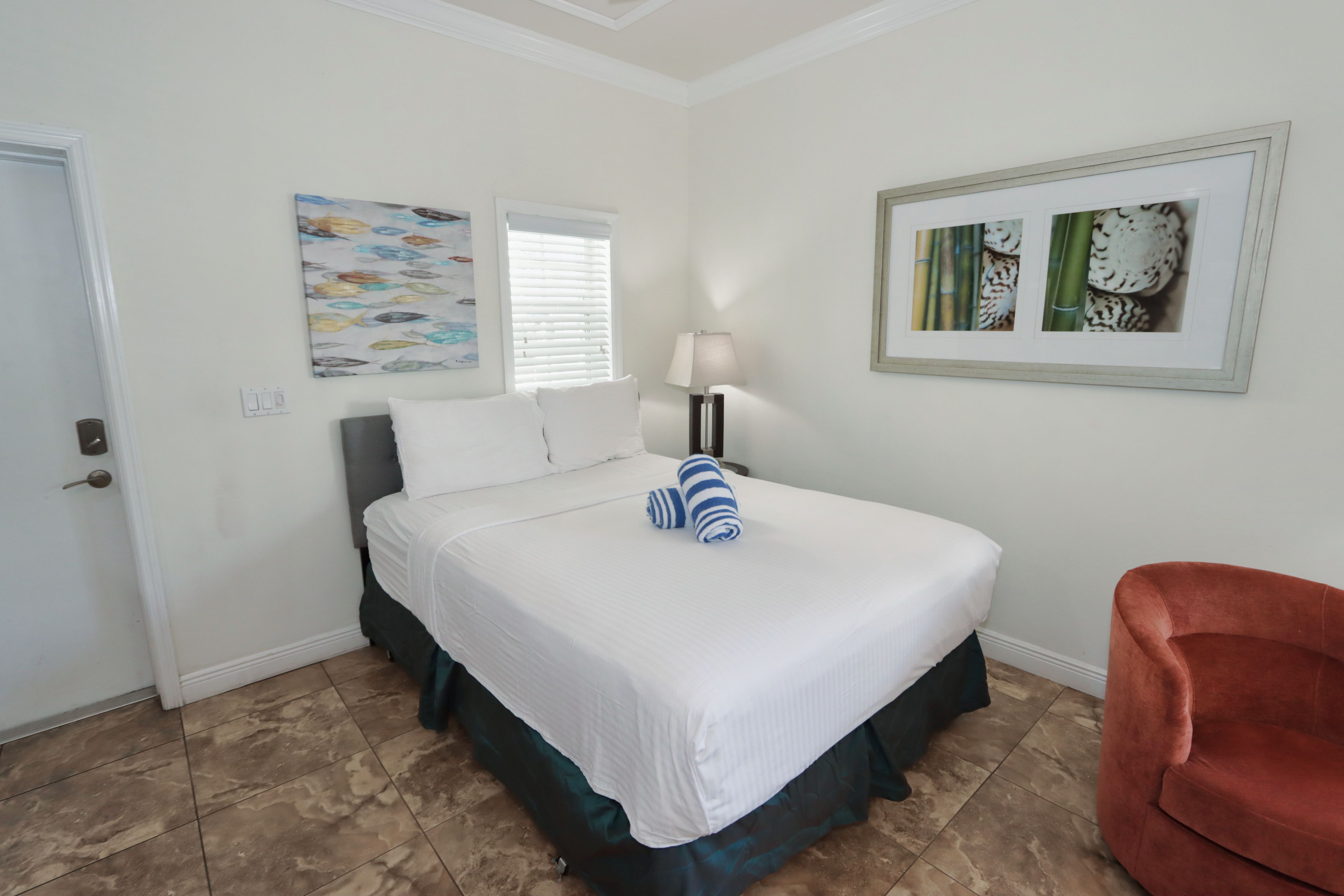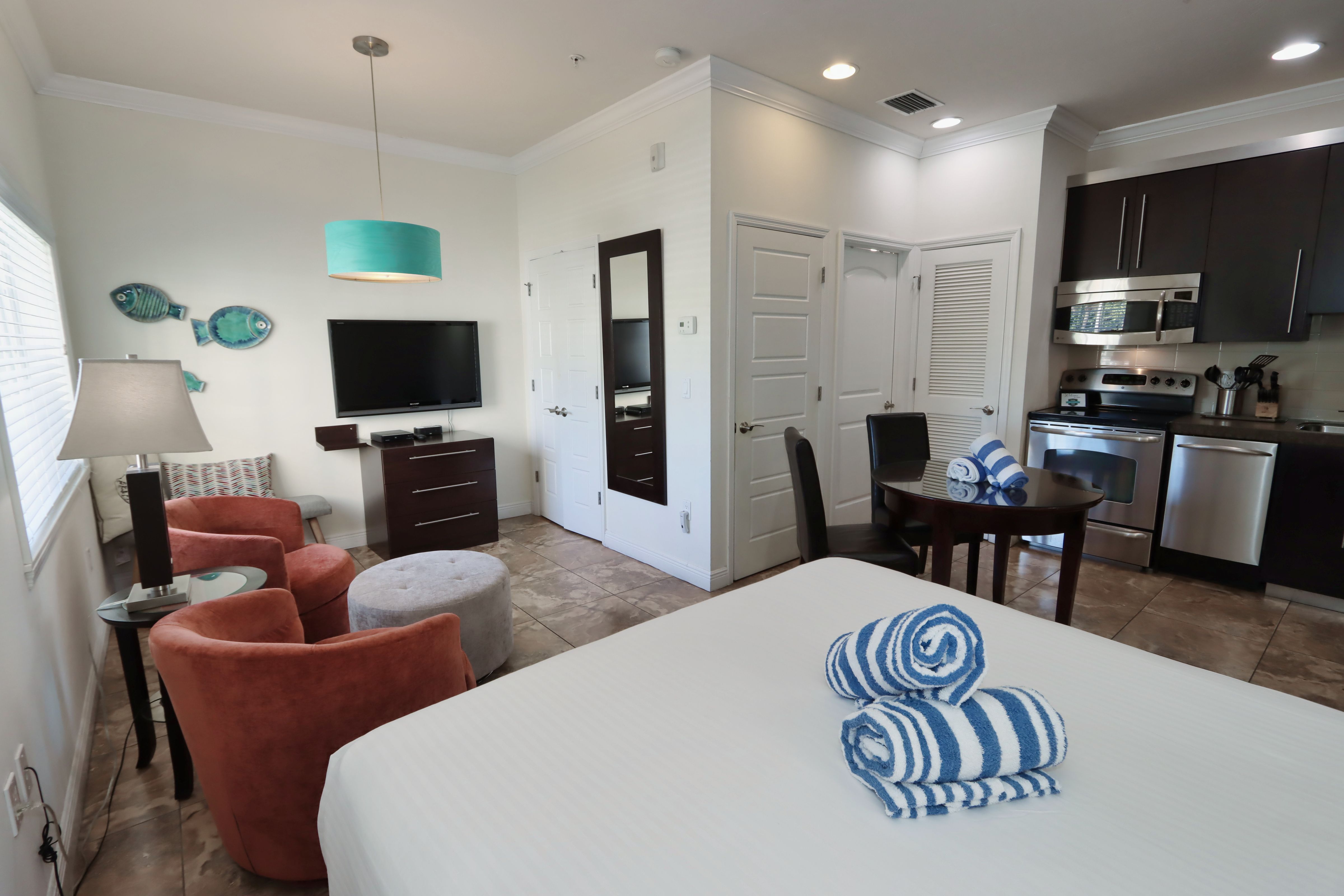 Our chic, modern accommodations feature clean lines, vibrant colors, and inviting spaces that reflect the spirit of Southwest Florida. Each unit is thoughtfully designed with your comfort in mind, boasting a full-size kitchen, Avonite countertops, stainless steel appliances, a large flat-screen TV, and luxurious Four Seasons bedding.